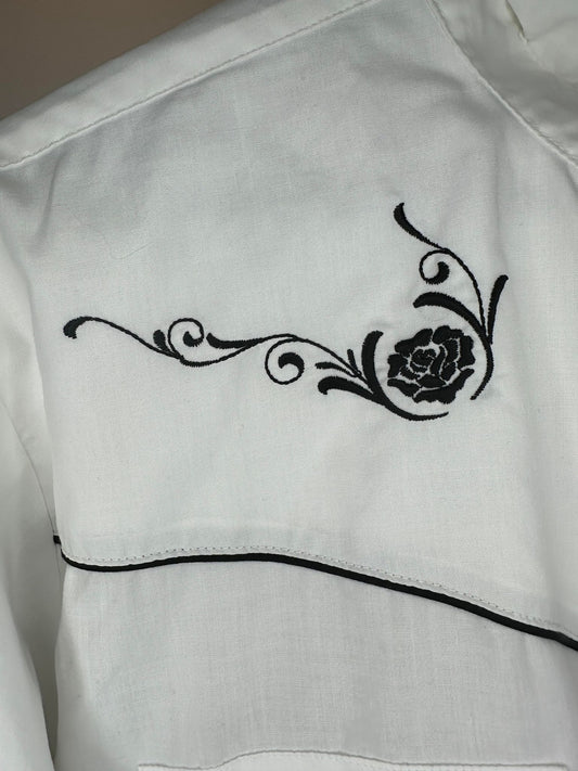 Y2K x MWG Apparel x Rose Embroidery x White w/ Black Accent Western Long Sleeve Button Up - 16 1/2 (L)