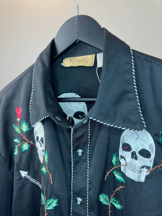 Skully x Skull & Roses Embroidery x Black Long Sleeve Western Button Up - L