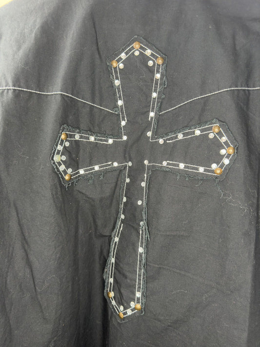 Y2K x Classic Western x Bedazzled Cross x Black w/ White Stitching Long Sleeve Western Button Up - XL