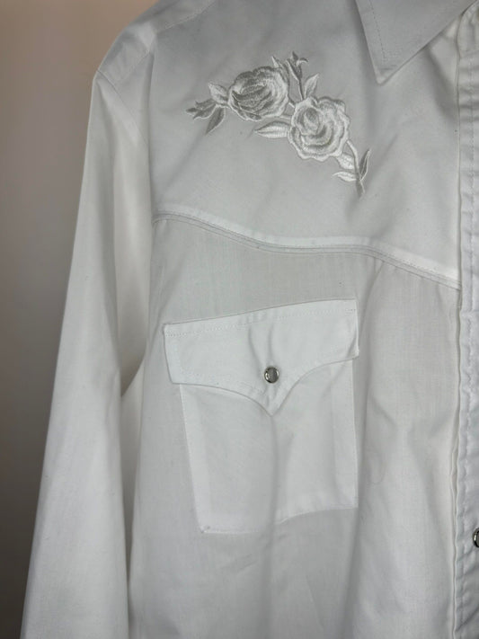 VTG x Ely Cattleman x Rose Embroidery x All White Western Long Sleeve Button Up - L