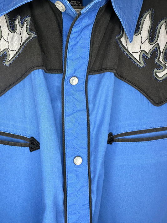 VTG x Johnny West x Flame Embroidery x Blue Black 2-Tone Western Long Sleeve Button Up - 16 1/2 (L)