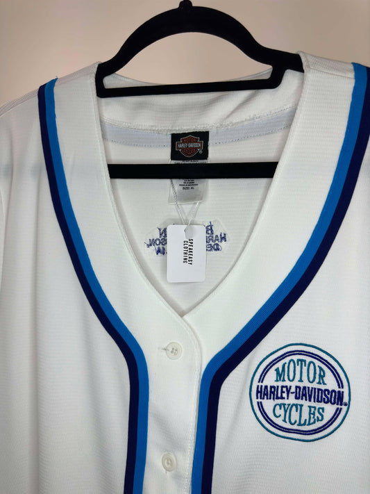 VTG x Harley Davidson x Big Barn Des Moines, IA x Blank White Blue Baseball Type Jersey - XL